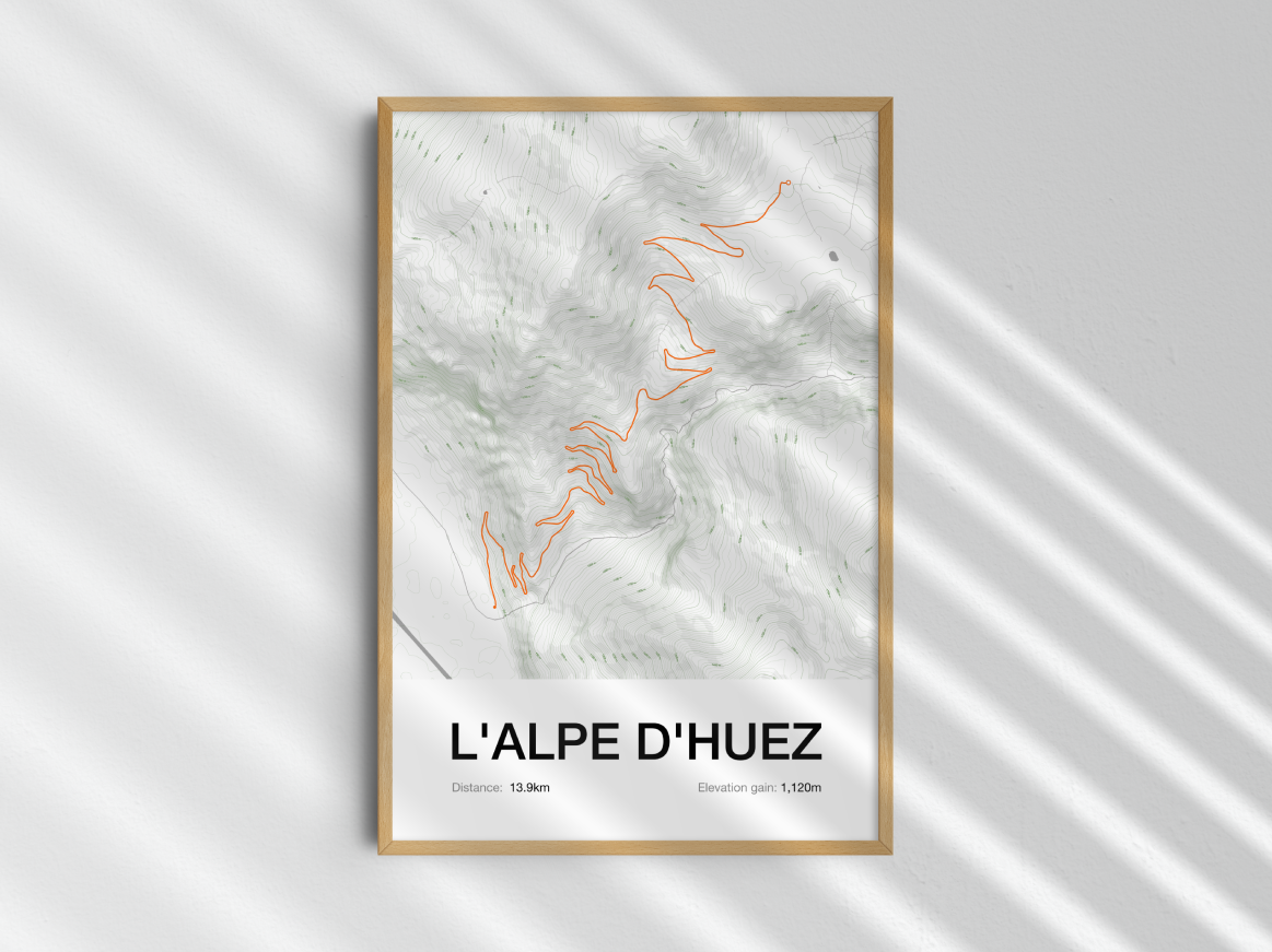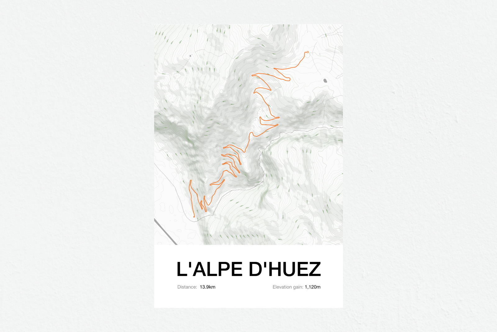 An inspiring art print of L'Alpe d'Huez with its mythical 21 bends, from our Iconic Climbs series. This artwork celebrates cycling's most famous ascent and the legendary mountain that has created countless Tour heroes.