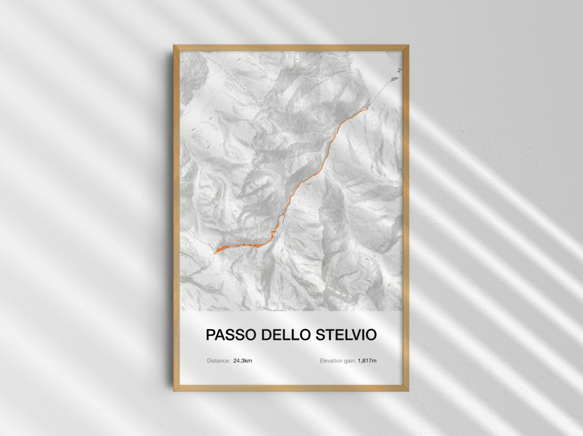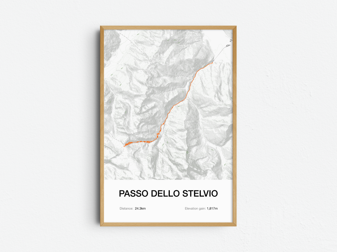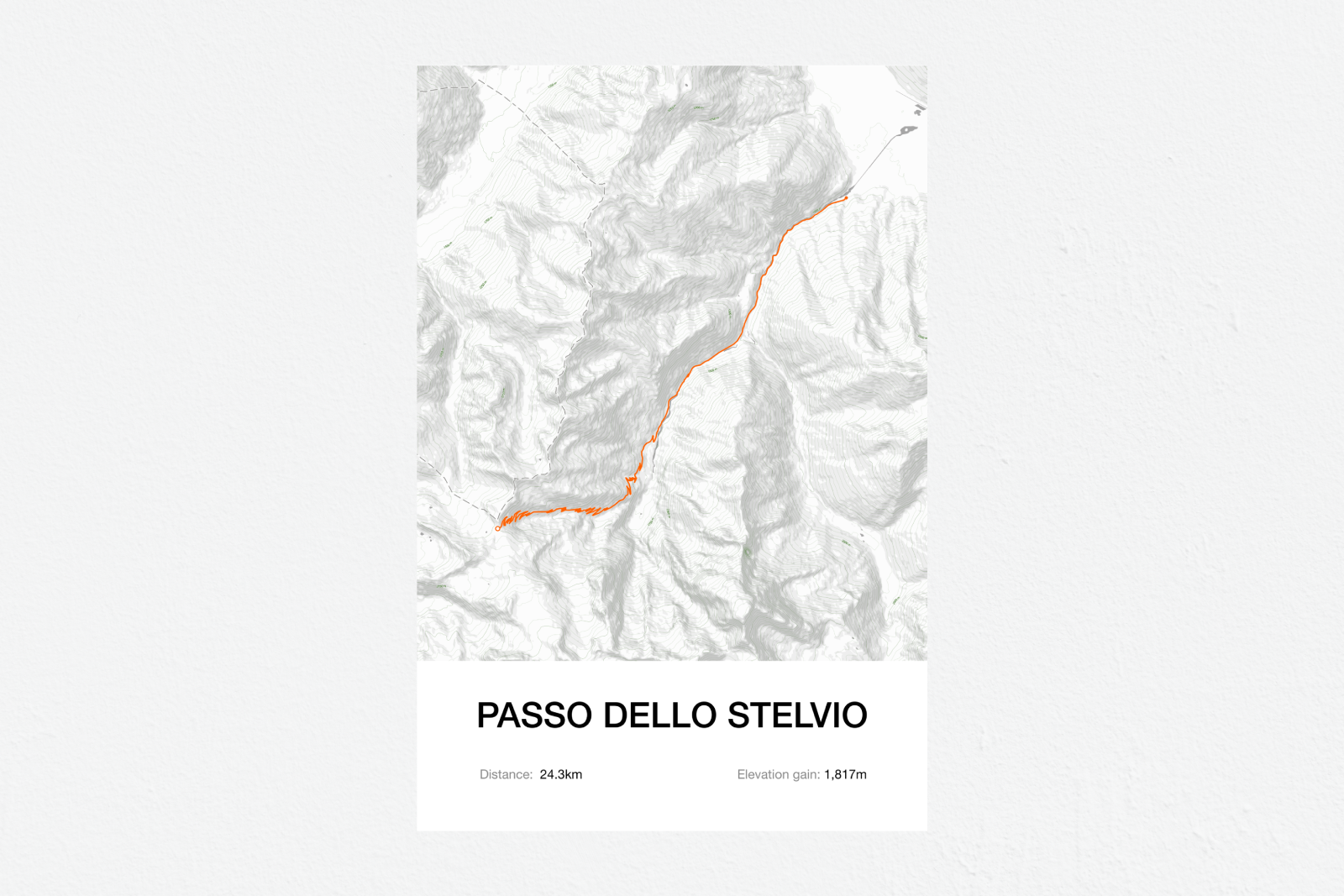 A dramatic art print of Passo dello Stelvio, the star of the Giro d'Italia topping out at 2,758m. This design celebrates one of Europe's highest paved passes and its legendary 48 hairpin turns in our Iconic Climbs series.