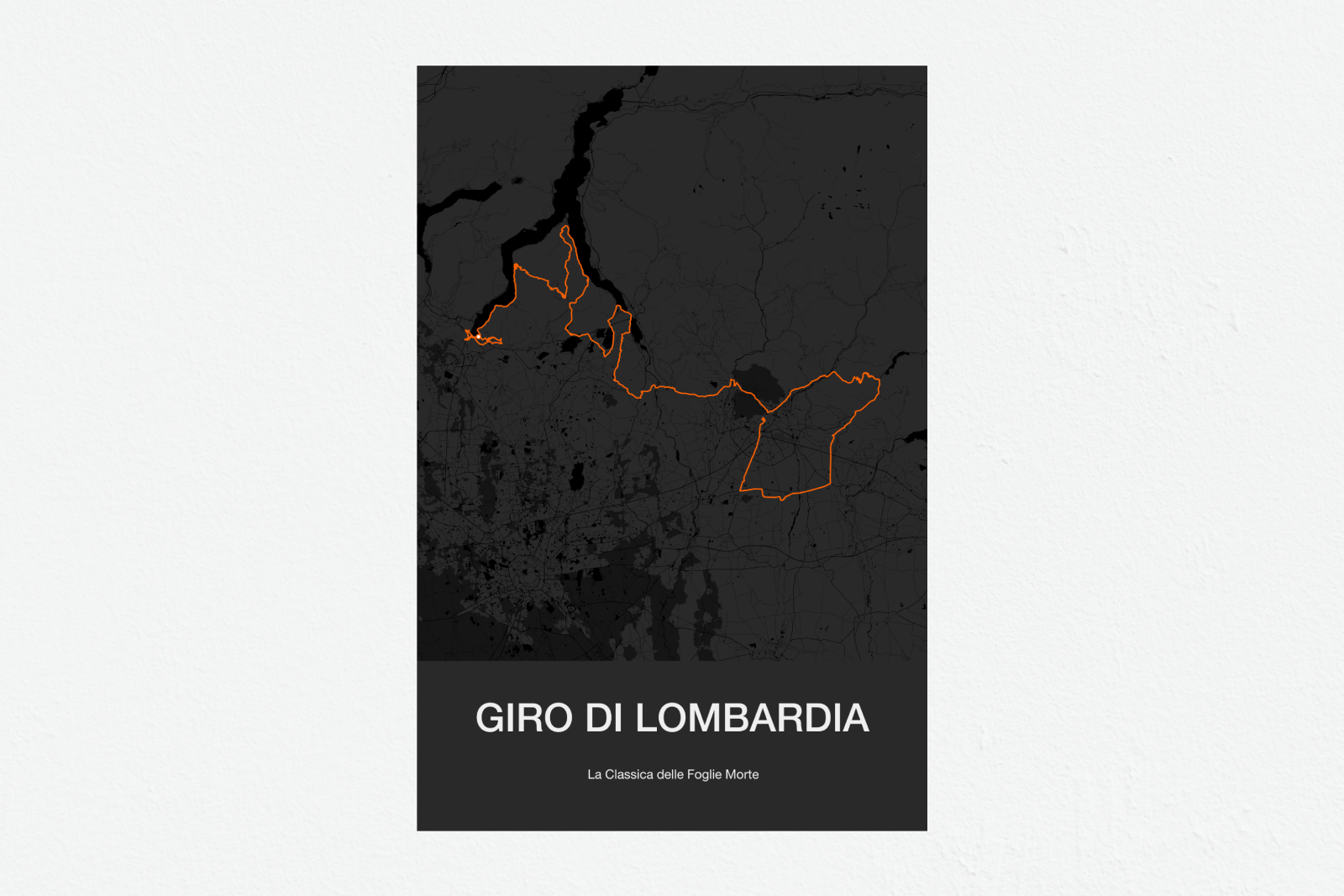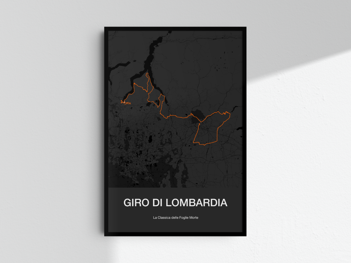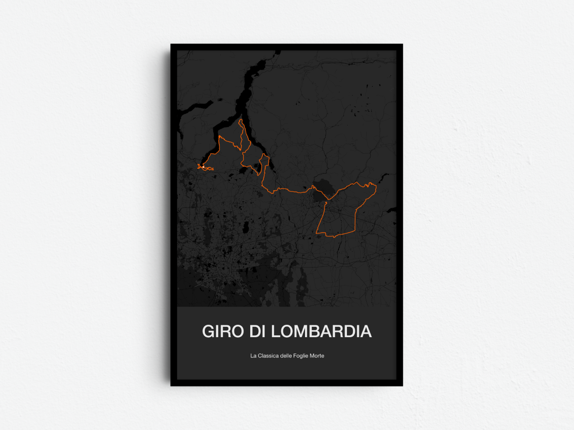 An artistic celebration of Il Lombardia, "The Race of the Falling Leaves" and the last of cycling's five monuments. This print honors the beautiful autumn classic that concludes the monument season in spectacular Italian style.