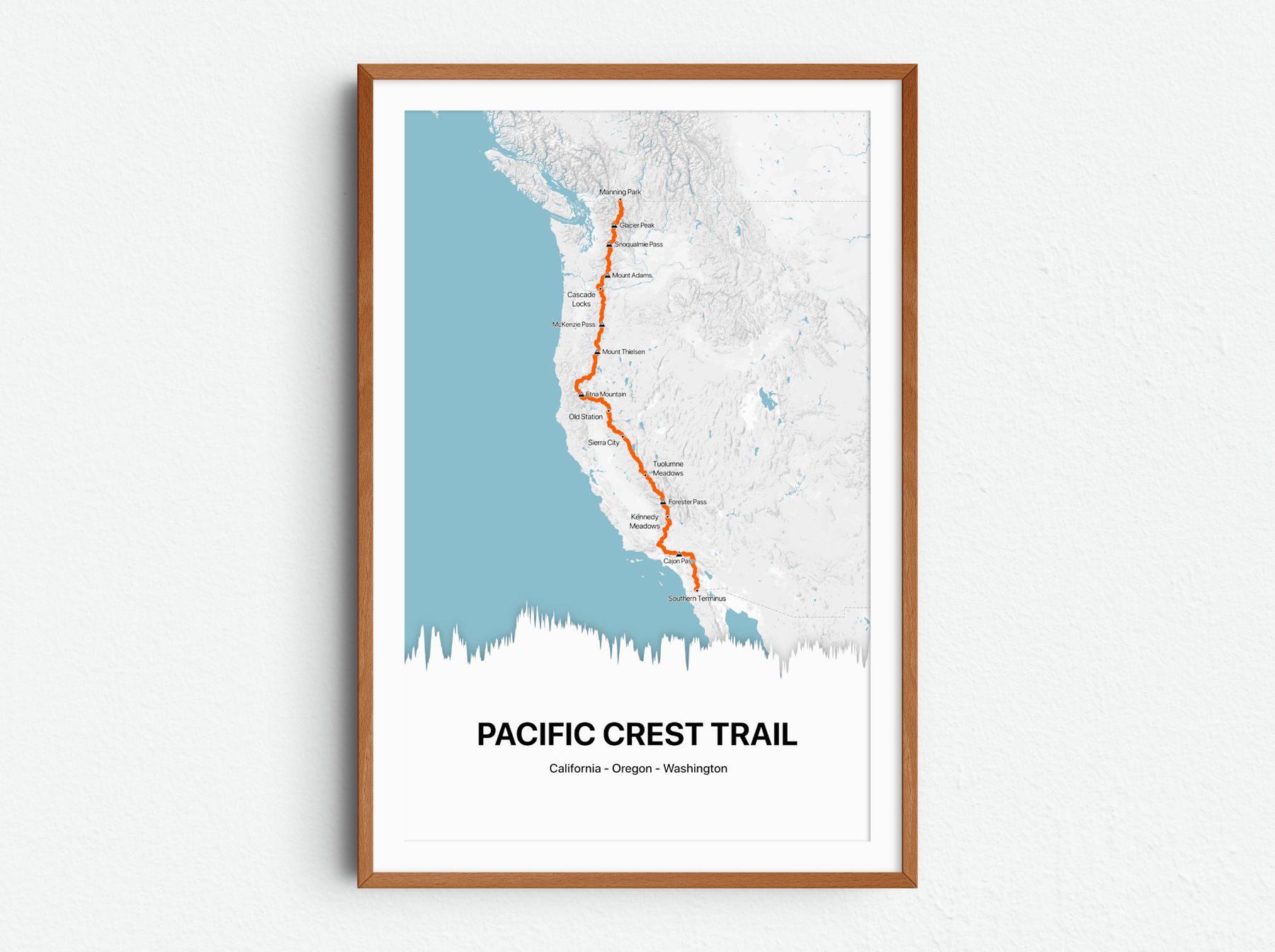 An epic map print of the Pacific Crest Trail, showcasing the breathtaking 2,655-mile journey through California, Oregon, and Washington. Perfect for thru-hikers, outdoor enthusiasts, and anyone inspired by America's most challenging long-distance trek.